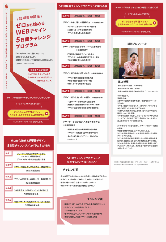 WEBデザインを学ぶ5日間チャレンジのLPです。WEBデザインを学ぶという新しい扉を開くイメージで作成しました。このチャレンジで得れれるもの、どんな内容であるかもブロックごとでわかりやすく伝わるよう心がけています。