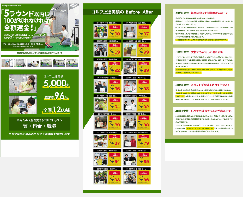 Golfperformance365様のLPです。24時間利用できることや、分析や丁寧な指導で上達できることを体験談や写真から伝わるように考えました。読みやすく目を引くような表現を心がけました。